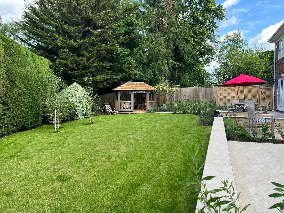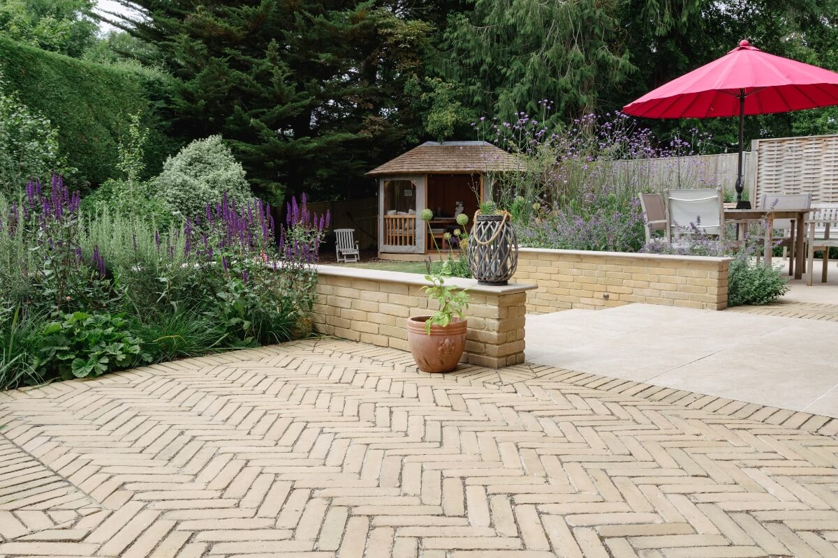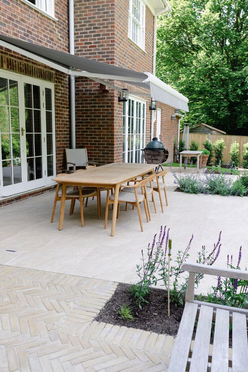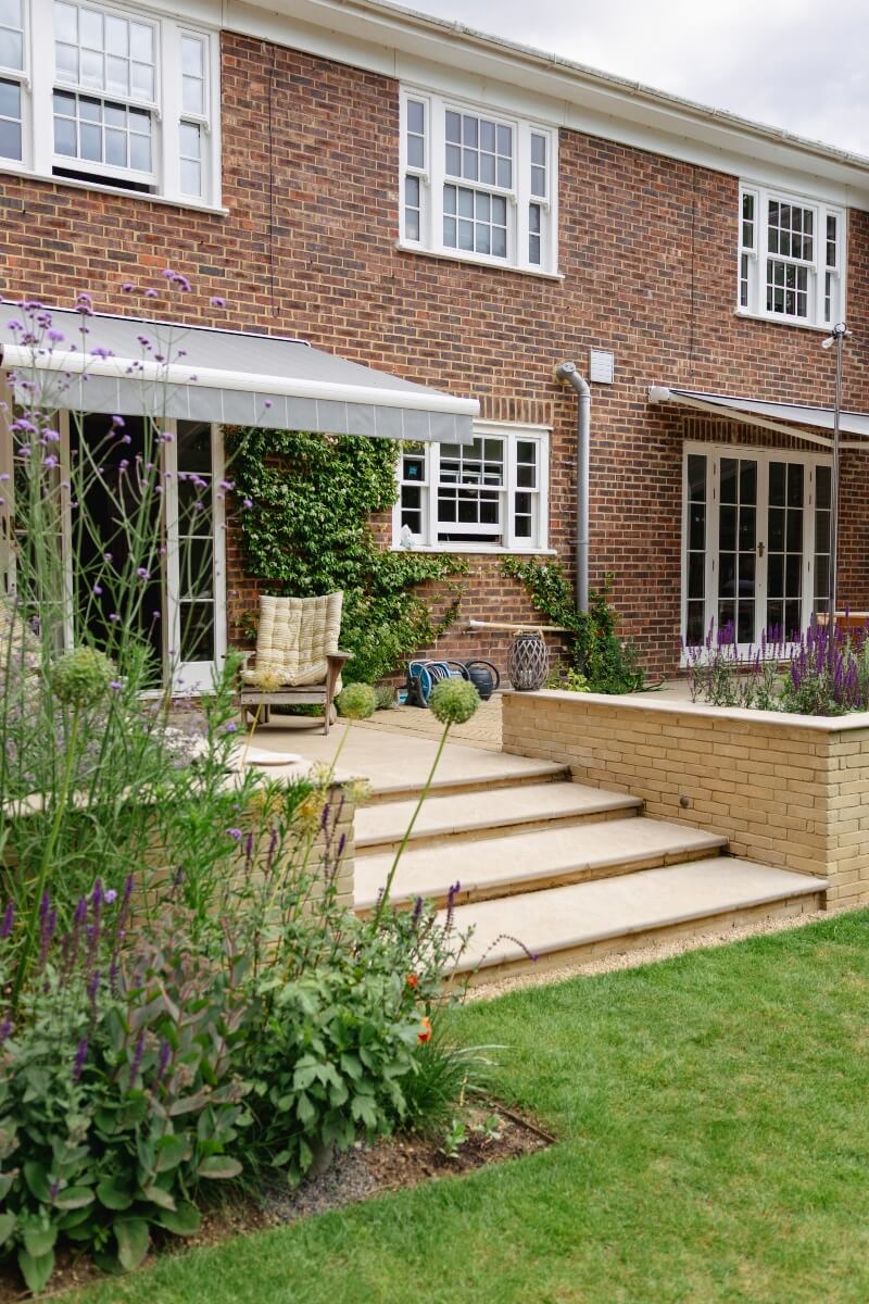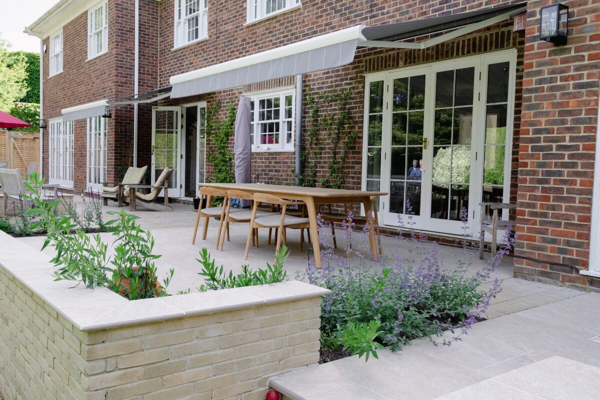 A long narrow terrace dominated by a mass of 2’ x 2’ pressed concrete paving slabs was transformed by an imaginative mix of Vandermoortel Clay pavers and porcelain from Caledonian Stone, whilst a Crown Pavilion provides a gorgeous place for the client to work wirelessly from home.