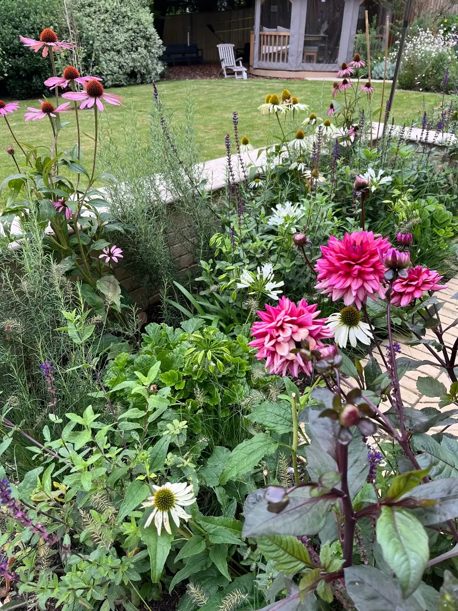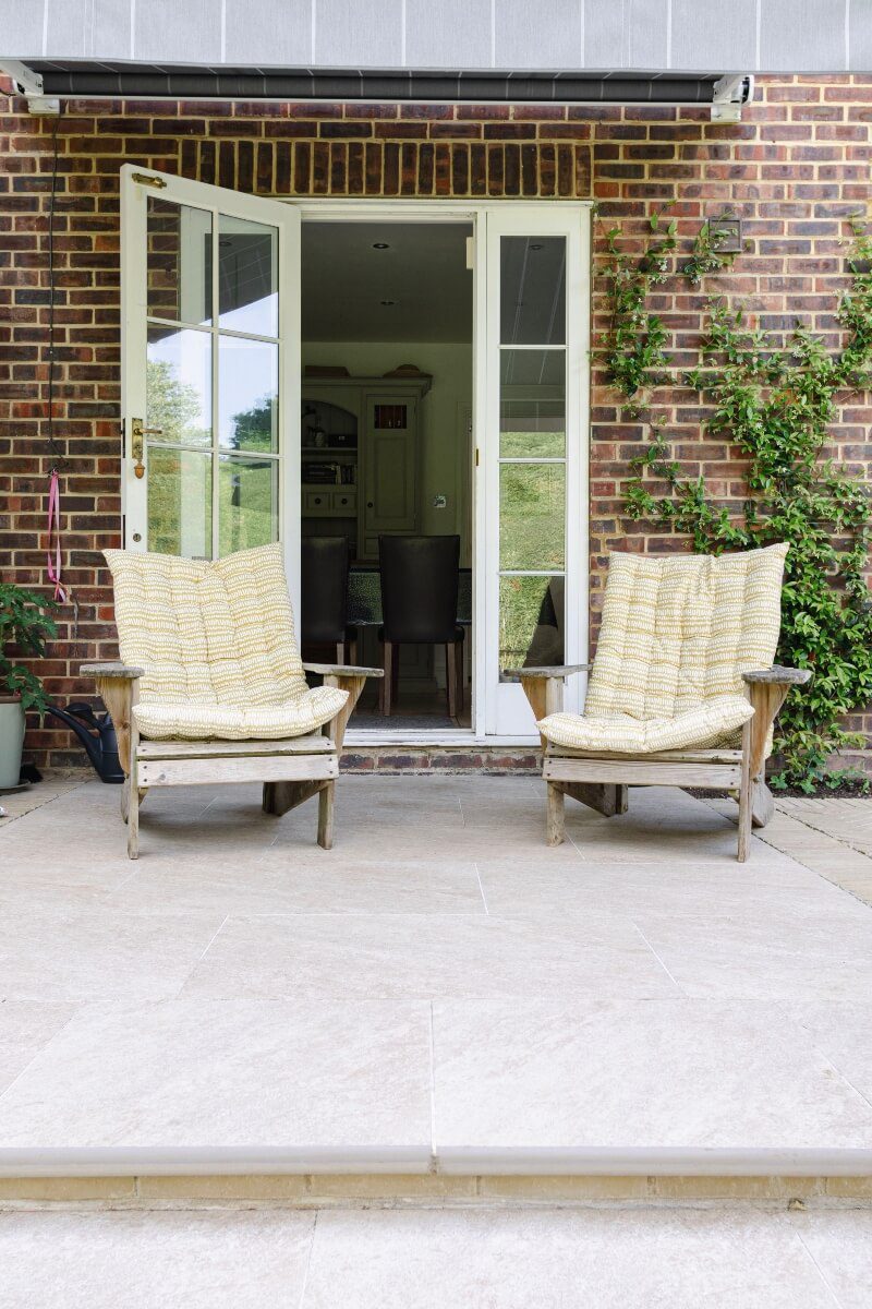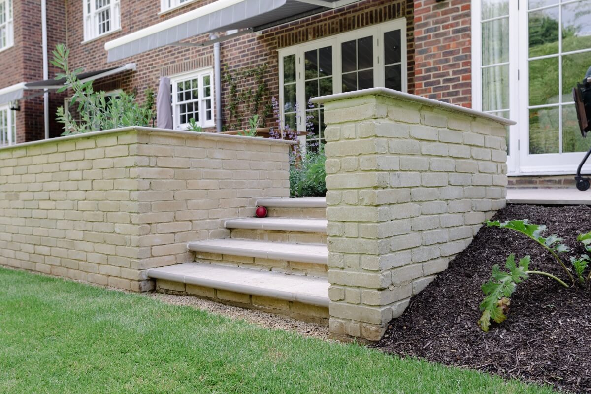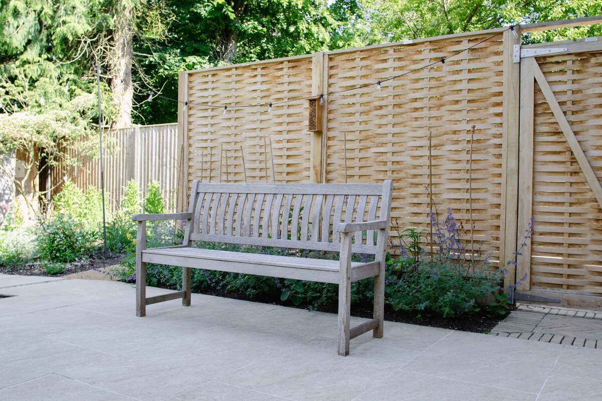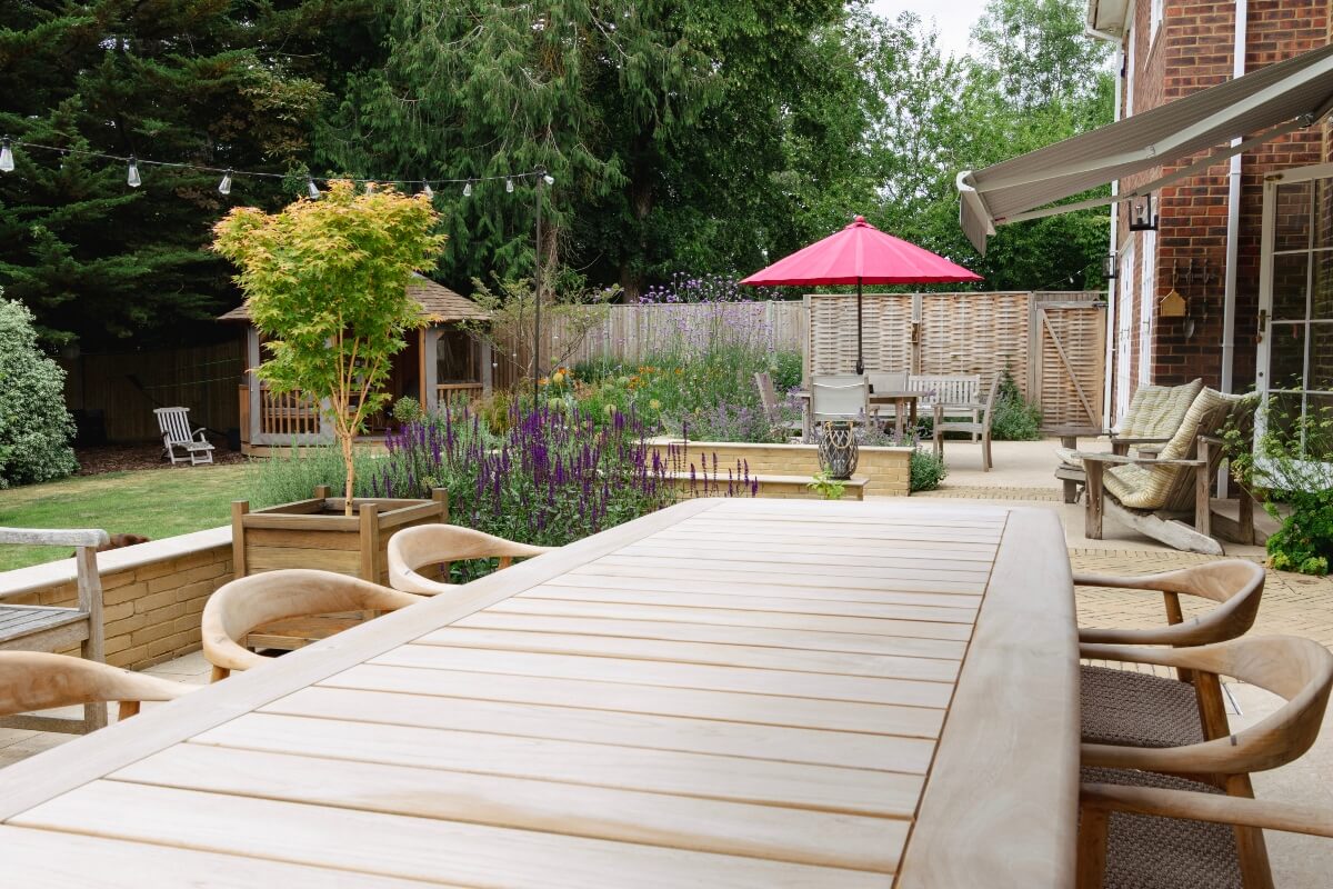 A long narrow terrace dominated by a mass of 2’ x 2’ pressed concrete paving slabs was transformed by an imaginative mix of Vandermoortel Clay pavers and porcelain from Caledonian Stone, whilst a Crown Pavilion provides a gorgeous place for the client to work wirelessly from home.