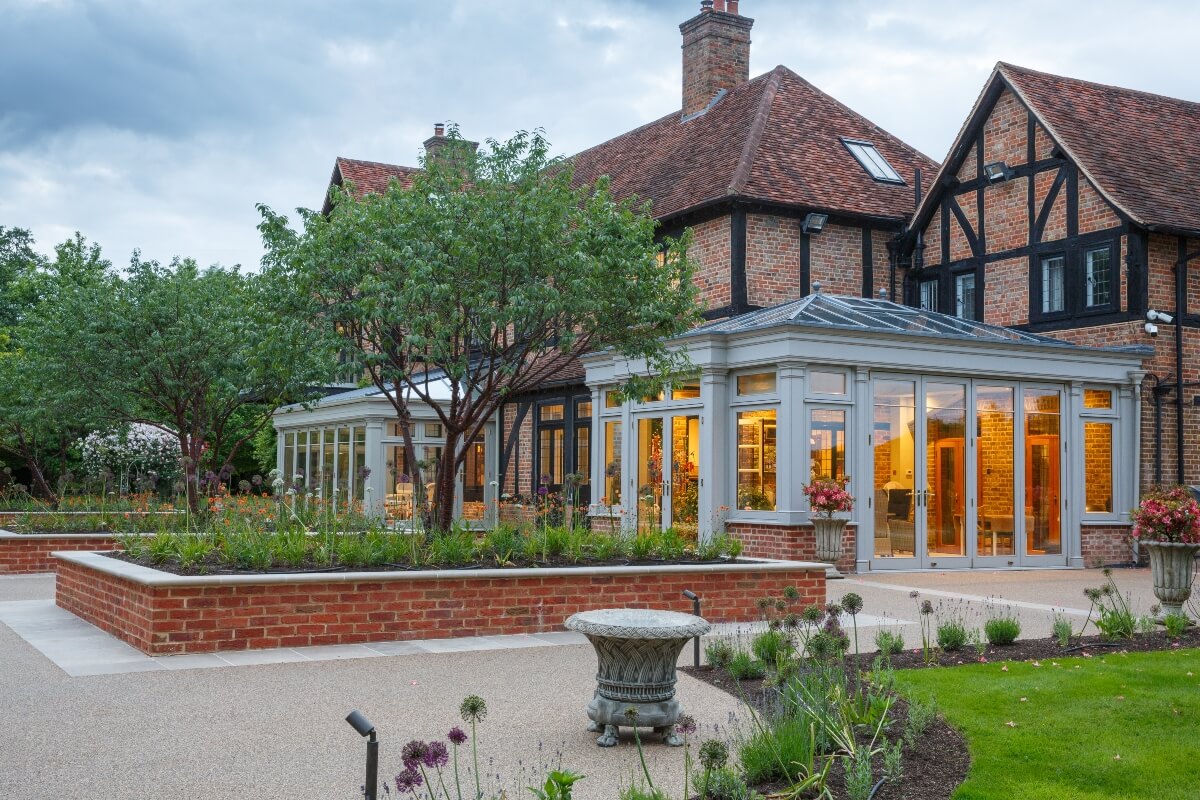 The clients initially proposed a terrace of resin bound gravel but we were fearful of the impact of such a dramatic monoculture of hard landscaping. Delving deeper into the brief, we discovered that a newly created Orangery was a key place they both enjoyed, whilst a replacement conservatory had also recently been commissioned.