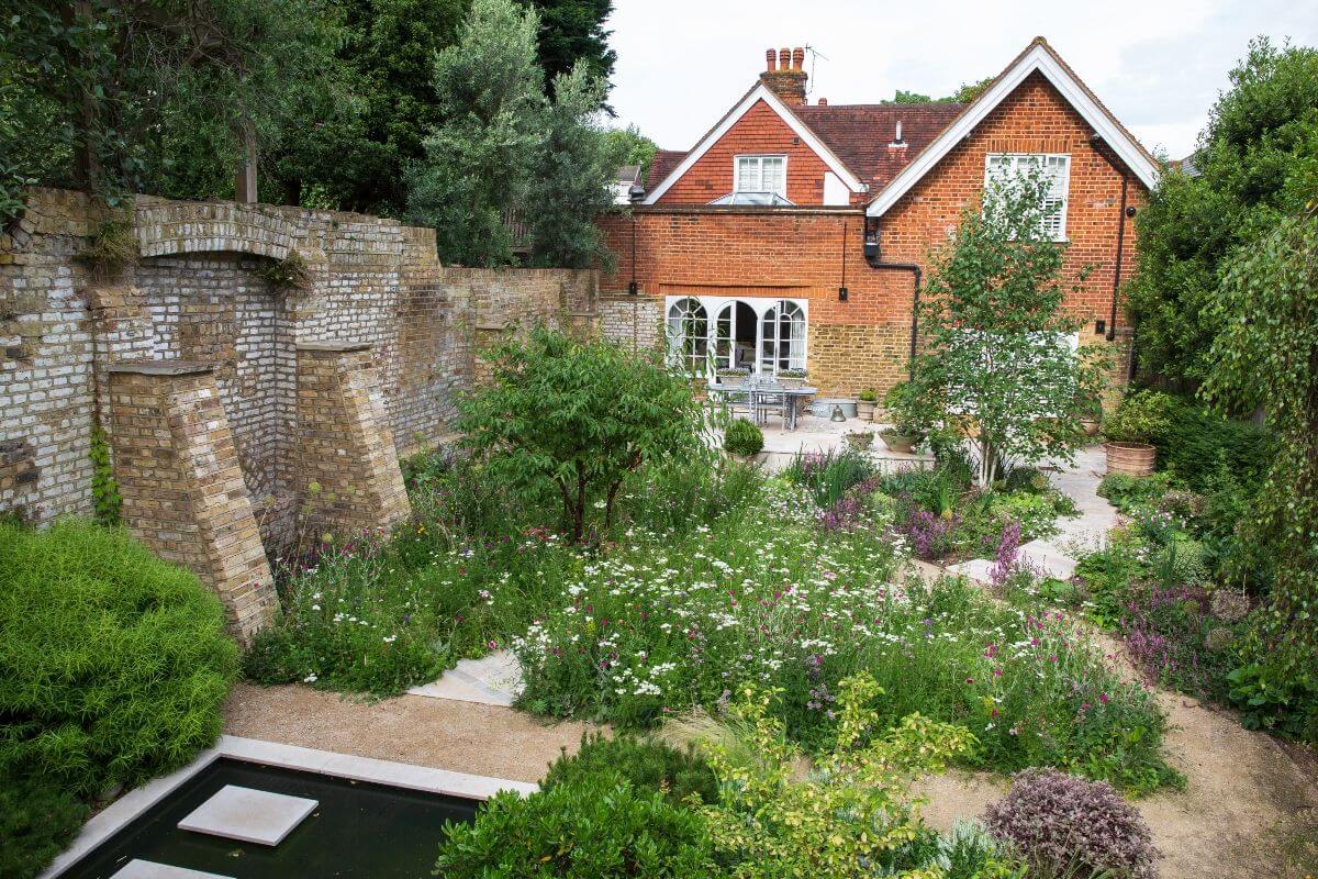 The rear garden of the former Coach House was frankly rather ordinary and uninspiring – laid to lawn with a few shrubs. The challenge was to create something striking, highlighting the stunning London Brickwork, whilst maximising the use of the modest space with the end result being wildlife friendly, incorporating water, wildflower meadows, stunning trees and several places to sit and ponder.