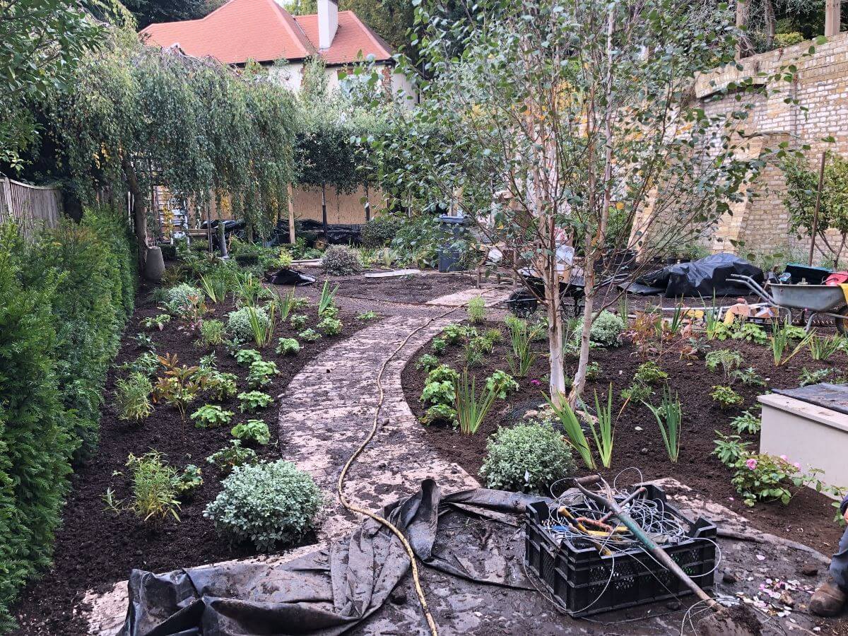 The wild flowers, trees, instant hedging and water feature are a haven for wildlife. Finished, and described by others as ‘real gem,’ the garden gives no clue to the fact that all the materials, diggers and dumpers had to come through the clients study!